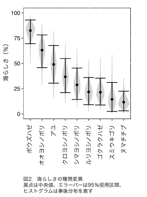 その結果、種間比較(9種)では、移動中の両側回遊性魚類の海らしさは中央値で11~82%の範囲にありました。これは、海水魚に比べれば低いものの、淡水に定住する魚類(河川加入後の両側回遊魚を含む)よりも高い値でした。(図2)。この結果は、両側回遊性魚類が、ほとんど海らしさを失った状態で川に入ってくる種からほとんど海の物質として入ってくる種まで、多様な海らしさで川へ海由来の物質を届けていることを示唆しています。