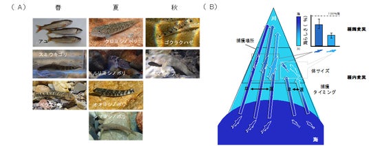 生涯の中で海と川を行き来する通し回遊性魚類は、生物体そのものあるいは排泄物を介して、海由来の物質を川に運んでいます。このような海由来の物質は、捕食者への直接の餌、遺骸の分解や排泄による有機物や栄養塩として、しばしば貧栄養でエサ不足に陥りやすい川の生態系を支えています。特に、それらが川に届けられる量や期間、季節性は、川の生物の生き方を変えることで、川の生物多様性や生態系の機能(物質循環)に影響します。このような海と川の繋がりは、遡河回遊をするサケ科魚類が暮らす高緯度地域では広く知られています。一方で、低-中緯度地域では、遡河回遊性魚類(113種)をはるかにしのぐ368種もの両側回遊性魚類が海と川の間を移動しています。その中には、我々日本人になじみの深いアユや郷土料理の材料になるゴリ(ヨシノボリ類やチチブ類;図1A夏、秋)も含まれています。しかし、それらがどのように海と川の繋がりを生み出しているのかはほとんど調べられていませんでした。両側回遊性魚類とサケ科魚類などの遡河回遊性魚類による海と川の繋がりには、決定的な違いがあります。それは、川に入った時に体に蓄えられている海由来の物質の割合(以下、海らしさ)が異なることです。多くのサケ科魚類は、産卵のために海から川に移動し、移動途中に餌をほとんど利用しないことから、海らしさを100%近く保った体のまま川に加入すると仮定されています。そのため、少数の種が似たような移動を行うサケ科魚類では、魚の重量を海由来の物質として評価できます。一方で、多様な両側回遊性魚類は、川に移動した後も生活を続けることから、移動途中にも川の餌を食べ、成長すると考えられます。したがって、移動に伴い、彼らの体を作っている海由来の物質が徐々に川由来の物質に入れ替わることで、海らしさが少しずつ失われる可能性があります(図1B)。さらに、摂餌量や移動にかける時間のような移動の仕方が種や個体によって多様であり、移動中の成長の仕方にも違いが生まれると考えられます。その結果、海らしさの失われ方にも多様性が生まれると考えられます(図1B)。そのため、海由来の物質の量や期間、季節性を評価する際、移住の仕方が多様な両側回遊性魚類では、魚の重量に加え、種ごとや個体ごとに海らしさを考慮することが、より正確な評価に繋がると考えられます。