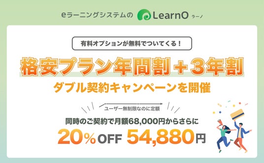 この度LearnOは、ユーザー数が千人から一万人以上と大規模なeラーニングシステム導入のお問い合わせの増加を背景に、「格安プラン年間割」と「3年割」を同時にご契約をいただいたお客様を対象に、有料オプションをプレゼントいたします。