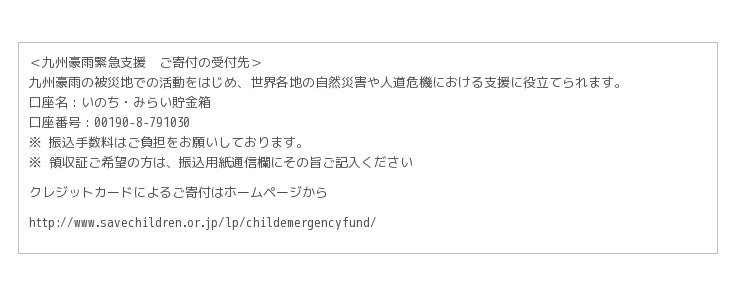 「夏休みを前倒しにするという朝倉市の決定を受けて、子どもたちの居場所となる学童保育所への支援を最優先に行うことに決めました。夏休みの子どもたちの生活が、少しでも安全で安心なものになるよう、必要な支援だと考えています。」セーブ・ザ・チルドレン・ジャパン 国内事業部部長 津田知子