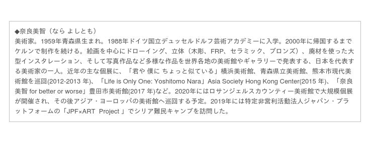 2019年3月、奈良美智さんは、ジャパン・プラットフォーム企画「JPF× ART Project」 でヨルダンを訪問。シリア難民キャンプやアンマン市内で暮らす、シリア人家族や子どもたちと時間を過ごしました。「難民問題という大きなくくりではなく、家族という小さな単位で見ている」と奈良さん。出会った子ども一人ひとりに思いを馳せながら、『THINK ABOUT A REFUGEE』キャンペーンのためのカードデザインにご協力くださいました。
