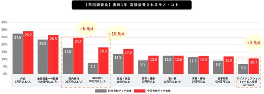 近年の物価高にもかかわらず、令和リッチの高額消費は前回の調査から全体的に増加傾向となりました。特に国内・海外旅行とサブスクリプションの消費は、大幅に消費が加速しています。