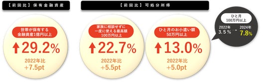 令和リッチの金融資産は増加傾向にあり、金融資産を1億円以上保有する層は約3割存在することがわかりました。また、家族に相談せずに一度に使える最高額が100万円以上と回答した割合は5.5pt増加、ひと月の小遣い額は50万円以上が5pt、100万円以上は前回の調査から倍増している結果となり、可処分所得も増加傾向にあることが伺えます。
