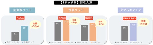 副収入源は「株式配当」と「投資信託」が多い中、起業家リッチは「YouTube」、世襲リッチは親から受け継いだと考えられる「株式配当」と「投資信託」、ダブルエンジンは「不動産賃貸収入」の割合が高いなど、それぞれに副収入源に特徴が見られました。