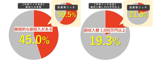 令和リッチの約半数は継続的な副収入があり、なかでも起業家リッチは約6割と他のリッチ層より割合が高い傾向にあります。また副収入がある2割は、年間1,000万円以上の収入がある結果となりました。