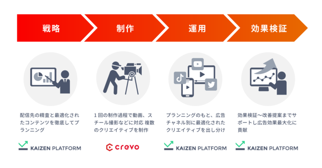 日本最大級の動画制作プラットフォームを運営し、大手企業からスタートアップまで2000社以上の制作実績を誇るCrevo(クレボ)株式会社(本社:東京都目黒区、代表取締役:柴田憲佑、以下「Crevo」)と、 目的や配信先に合わせた動画クリエイティブの編集により、広告効果の改善に強みを持つ株式会社Kaizen Platform(本社:東京都港区、代表取締役:須藤 憲司、以下「Kaizen Platform」は、共同パッケージ「Kaizen Platform×Crevo 動画広告パッケージ」の提供を開始します。