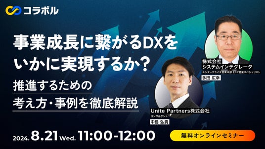 株式会社システムインテグレータ(本社:さいたま市中央区、代表取締役社長:引屋敷 智、東証スタンダード:証券コード3826)は、Unite Partners株式会社(東京都品川区、代表取締役:小林 大輝)と「事業成長に繋がるDXをいかに実現するか? 推進するための考え方・事例を徹底解説」と題した無料ウェビナーを8月21日(水)に開催することをお知らせします。
