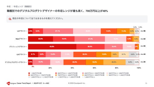 - 職種による年収帯の乖離は大きく、グラフィックデザイナーの69.1%は年収400万円未満である一方、デジタルプロダクトデザイナーの半数近くが年収700万円以上に