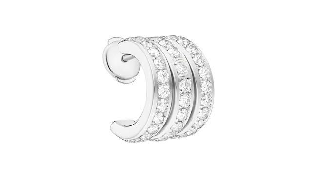 「ポセション」コレクション初となるシングルイヤリングが登場します。ピンクゴールド製とホワイトゴールド製の1連のイヤリングと、ホワイトゴールド製の3連のイヤリングにはそれぞれ、1列に並んだダイヤモンドの中央にシグネチャーのハーフムーンセッティングのダイヤモンドが輝きます。ペアまたは片耳で、あるいは3連イヤリングとアシンメトリーやスタッキングなど、コーディネートの幅が広がります。