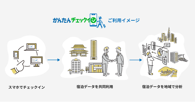 このうち、参画施設の負担なくデータを集めるための仕組みづくりにおいて、PMS等を導入していない小規模施設を中心に少なからず負担が生じており、その解消が課題となっておりました。そのため、参画施設にもデータ提供のメリットがあり、負担なく地域で活用するデータを集める仕組みづくりができるツールとして『かんたんチェックイン』をリリースしました。