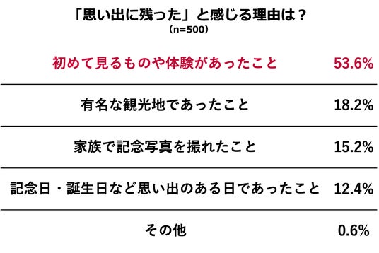 3. 家族のおでかけ先に求めるものは、「手軽さ」が6割と最多。一方、「思い出に残った」と感じる理由としては、「初めて見るものや体験があったこと」との回答が半数以上と最も多い結果になりました。おでかけ先のマンネリ化の中で、「手軽さ」を求めることが多いものの、思い出に残るおでかけにするためには「初めて見るものや初体験」を求めるという、ジレンマが見られます。