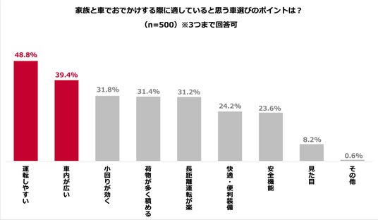 5. 家族とのおでかけに適していると思うクルマ選びのポイントは「運転のしやすさ」「クルマ内の広さ」が上位に。さらに、家族のおでかけ先を決める際に工夫していることを調査すると、「メジャーどころは避ける」「天候に左右されないよう複数のおでかけ先を用意する」「定期的におでかけ先はチェックしてメモに残す」など様々な回答がありました。