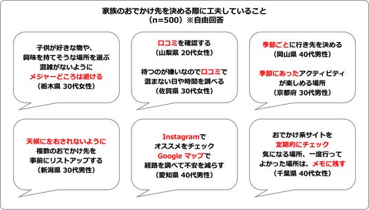 5.家族とのおでかけに適していると思うクルマ選びのポイントは「運転のしやすさ」「クルマ内の広さ」が上位に。さらに、家族のおでかけ先を決める際に工夫していることを調査すると、「メジャーどころは避ける」「天候に左右されないよう複数のおでかけ先を用意する」「定期的におでかけ先はチェックしてメモに残す」など様々な回答がありました。