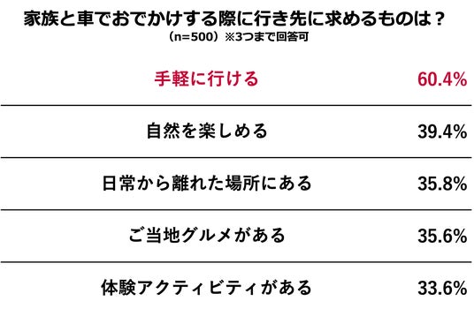 3.家族のおでかけ先に求めるものは、「手軽さ」が6割と最多。一方、「思い出に残った」と感じる理由としては、「初めて見るものや体験があったこと」との回答が半数以上と最も多い結果になりました。おでかけ先のマンネリ化の中で、「手軽さ」を求めることが多いものの、思い出に残るおでかけにするためには「初めて見るものや初体験」を求めるという、ジレンマが見られます。