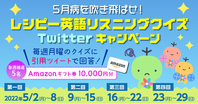 株式会社ポリグロッツ(本社:東京都新宿区、代表取締役:山口隼也)は、5月2日(月)~5月29日(日)まで英語リスニングクイズTwitterキャンペーンを開催いたします。クイズにご正解した方の中から抽選で、 Amazonギフト券1万円分を合計20名の方にプレゼントいたします。