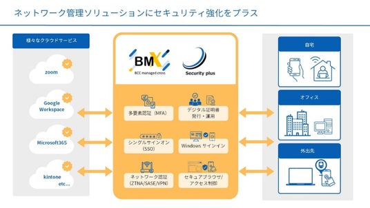 「BM X Type M Security plus」は、BM X Type Mで提供するネットワークハードウェアおよびリモートアクセス機能に、多要素認証とID管理を組み合わせ、VPNの脆弱性対策と運用負荷軽減を同時に実現するセキュリティパッケージです。