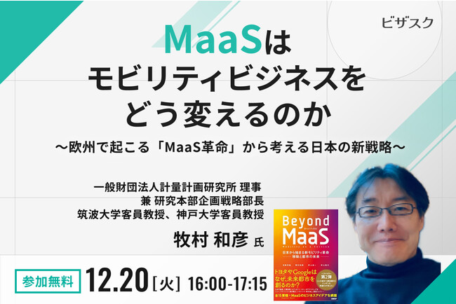 「知見と、挑戦をつなぐ」をミッションにグローバルなナレッジプラットフォームを運営する株式会社ビザスク(以下、当社)は、「欧州で起こる『MaaS革命』から考える日本の新戦略」をテーマに、ベストセラー「Beyond MaaS 日本から始まる新モビリティ革命-移動と都市の未来-」共著者で、一般財団法人計量計画研究所理事である牧村 和彦氏のご登壇による無料オンラインセミナーを、12/20(火)16時より開催します。
