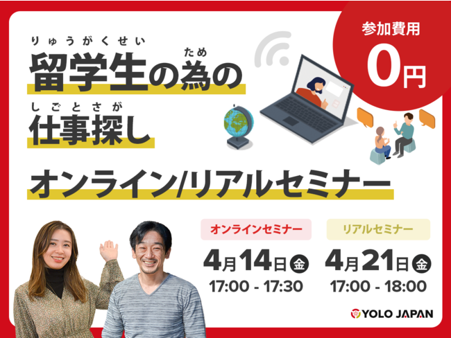 226の国と地域出身の24万人の在留外国人が登録している日本最大級のメディアを運営する、株式会社YOLO JAPAN(代表取締役:加地太祐、大阪本社:大阪市浪速区、以下「YOLO JAPAN」)は、2023年4月21日(金)より外国人向けの就労支援としてお仕事情報や探し方を伝えるセミナー「YOLO WORK CAMP」を開始することを発表します。