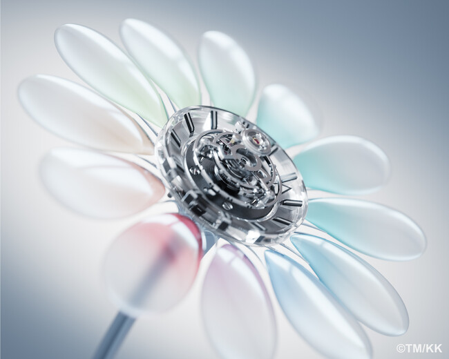 センターフライングトゥールビヨンは、サファイアクリスタル製の12枚の花びらで構成された、村上隆氏のアイコニックなモチーフである「お花」に囲まれています。この「お花」は、柔らかに描かれたカーブと大胆でゆったりとしたボリュームが特徴です。サファイアケース、サファイアケースバック、そしてサファイアリューズ、半透明のフランジとストラップなど、「MP-15」の輝きを最大限に引き出すために、ウブロが目指したのは絶対的な透明性です。太陽の光は、この「お花」の芸術作品を単に照らすだけでなく、その曲線やレリーフを照らしながら、まっすぐに通り抜けるのです。