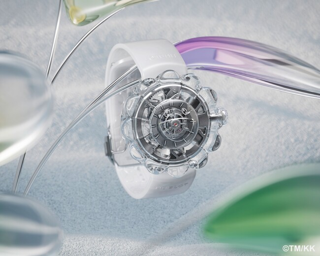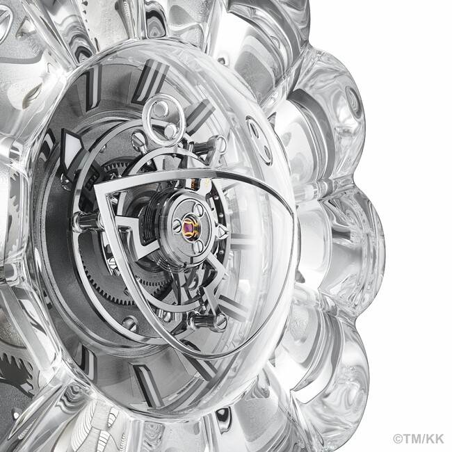 このセンターフライングトゥールビヨンは、このタイプのコンプリケーションとしては偉業と言える、約150時間という驚異的なパワーリザーブを備えています。この時計を完全に巻き上げるために、ウブロは特別なスタイラスを開発しました。専用に設計され、USBで充電可能なこのスタイラスをリューズにセットすると、センタートゥールビヨンを駆動する二つの香箱が完全に巻き上げられるまで、スムーズかつ簡単に100回転させることができます。このセンタートゥールビヨンは、機能的にも視覚的にも楽しむことができ、村上隆氏は、キラキラと輝く2つの目と満面の笑みを取り入れることで、この時計のチャーミングな特性を見事に表現しています。