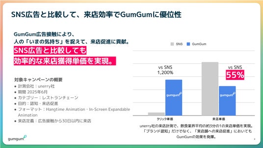 その結果、unerryの来店計測により、GumGumのコンテキスト広告は、飲食業界平均と比較して約3分の1の来店単価を実現。SNS広告と比較しても、効率的な来店獲得につながっていることが確認されました。