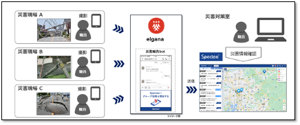 「Spectee Pro」の地図・ダッシュボード上に、「elgana(R)」で撮影した画像と作成した文章を投稿する仕組みを新たに構築し、合わせて「elgana(R)」のチャット機能を用いて、クローズドな環境で情報共有ができるようになります。この仕組みにより、災害時のリアルタイムな情報収集・共有を可能とし、発災時における迅速な初動行動に繋がることが期待できます。