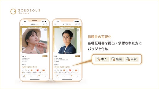 2022年10月サービスリリース。ゴージャスは、理想のお相手と出会いたいと考える男女をターゲットとした、「あなたにふさわしい、ハイクラスな出会い」を実現する完全審査制の恋活・婚活マッチングアプリです。 ゴージャスは、AIを用いた独自の審査を通過した会員のみが利用可能です。ハイクラスな出会いをご提供するため、あなたにふさわしいお相手を毎日ピックアップ。