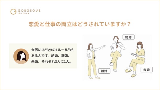 「女医には、“3分の1ルール”とよく言われる話があります。3人に1人は結婚、3人に1人は離婚、さらに3人に1人は未婚、といった感じです。実際、女医は結婚が難しいという実感もありますね。」(20代・女性医師)