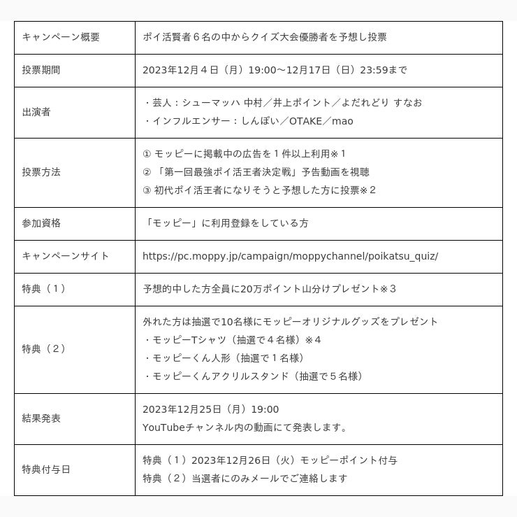 この度、視聴者に楽しみながらポイ活を学んでいただきたいという想いから初の視聴者参加型のキャンペーンをご用意しました。当キャンペーンでは、「モッピー」に利用登録をしている方ならどなたでも参加可能です。動画では、2年間で100万ポイントを稼いだ経験を持つ芸人シューマッハ中村さんや、ポイ活主婦インフルエンサーとして活躍するmaoさん等が出演します。参加者は出演者の中から優勝者を予想し投票。見事予想が的中した参加者全員に20万ポイントを山分けいたします。外れてしまった方も抽選でモッピーグッズを用意しております。