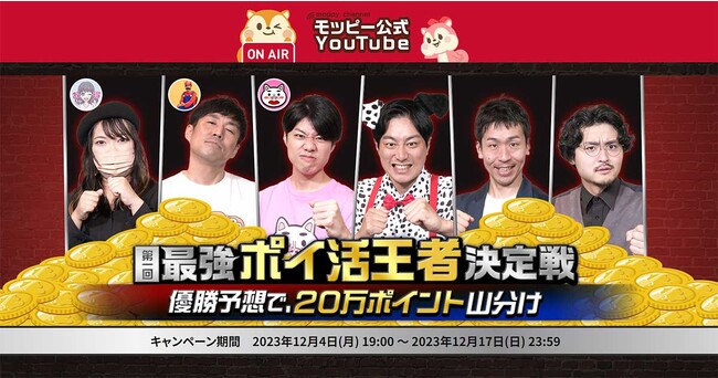 株式会社セレス(本社:東京都世田谷区、代表取締役社長:都木 聡、証券コード:3696、以下セレス)は、自社が運営するポイントサイト「モッピー」の公式YouTubeチャンネルにおいて、2023年12月4日(月)から12月17日(日)までの間「第一回最強ポイ活王者決定戦」と題し、ポイ活賢者の中からポイ活クイズ王を決めるキャンペーンを実施いたします。