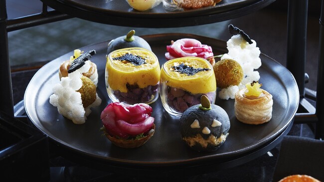 “マスカレード”をテーマにした今年のハロウィンアフタヌーンティーの主役は、ハロウィンキャットや、ジャック・オー・ランタンなどのお化けたちです。「ザ・ラウンジ by アマン」のダークなインテリアに合わせて作られた、オリジナルの特製黒竹スタンドを、オレンジや紫など秋らしい色をアクセントに、栗や南瓜といった旬の食材が彩ります。