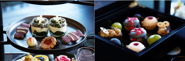 中段は、ホワイトチョコレートの十字架をあしらった抹茶のティラミスのほか、上品な甘みの南瓜とアプリコットのサブレ、優しい味わいの紫芋のクッキーなど、秋の食材を楽しめるスイーツが彩ります。そして、特製のジュエリーボックスには、シェフが細部までこだわったゴーストがモチーフのお菓子をご用意しました。棺桶に入ったミイラをイメージしたモンブランタルトや、キャラメルクリームの入った目玉型のココナッツムースなど、少し怖くてかわいいお化けスイーツをお楽しみください。