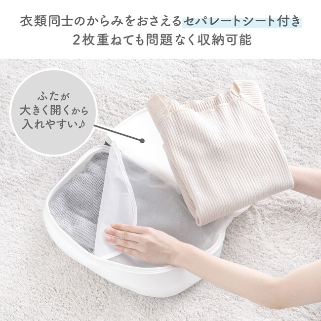 2着重ねて入れても、セパレートシートがネット内の衣類同士の絡みや摩擦を抑えます。また、ふたが大きく開くので、ニット類などかさばる衣類も入れやすい仕様です。