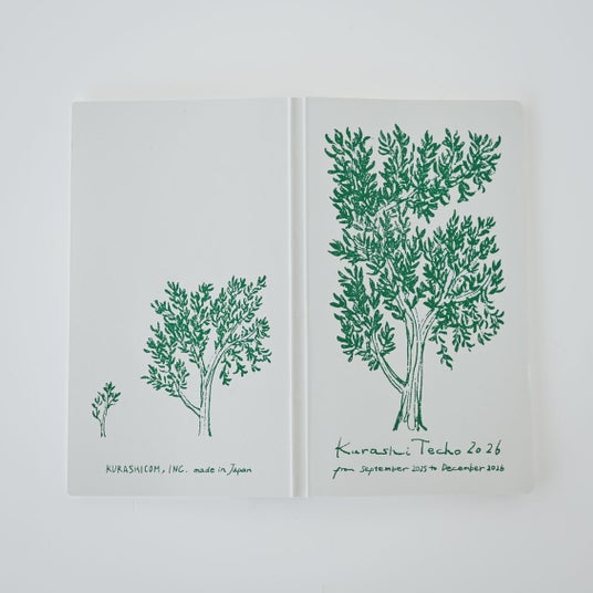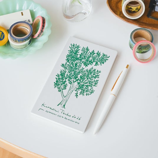 「クラシ手帳2026」は、落ち着いたグレートーンの表紙に、版画技法を応用しながら独自の世界観を描くアーティスト・coricci(コリッチ)氏による、深い緑色の箔で表現された大きな木のイラストが印象的なデザインです。