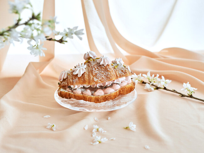 国産の発酵バターで焼き上げたサクサクのクロワッサンの中に、とろり滑らかなカスタードクリームと香り立つ桜の生クリームを重ね、アクセントに粒あんと砕いたチョコレートを加えました。