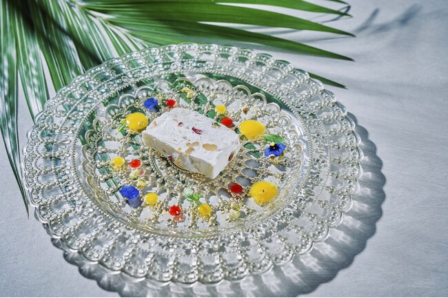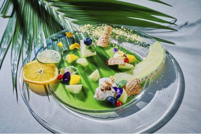 季節のクリエーション(1,830円)季節のフルーツをふんだんに使用し、夏を表現した一品 ※メロンソースをベースに、ドライナッツやドライフルーツを練り込んだアイスチーズケーキ、レアチーズケーキ、マンゴー、オレンジ、ライムなどの柑橘類、ココナッツ、エディブルフラワー、ミント、チャービルなどを使用