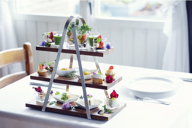 ⾊鮮やかな前菜を3段の専用スタンドに並べた「前菜スタンド~ガーデンからのおもてなし」と「Herb Garden」