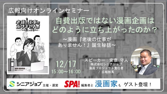 シニア転職支援の(株)シニアジョブ(本社:東京都新宿区/代表取締役 中島康恵/以下、シニアジョブ)広報部は、「自費出版ではない漫画企画はどのように立ち上がったのか?~広報向けセミナー・漫画『老後の仕事がありません!』誕生秘話~」を、2024年12月17日(火)15時よりオンラインで開催します。