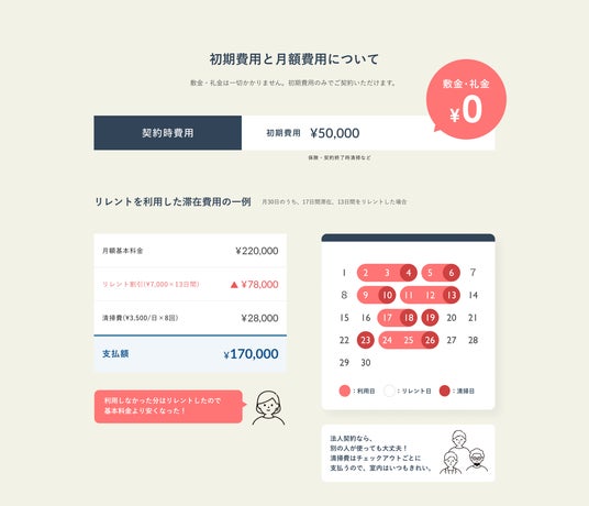 敷金・礼金は一切かからず、全室共通で初期費用5万円のみでご契約いただけます。東京都新宿区1K 25平方メートル の場合、月30日のうち17日は法人企業関係者が交代で滞在し、13日をリレントした支払額は17万円です。