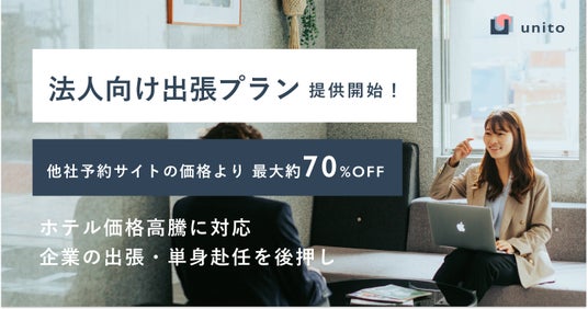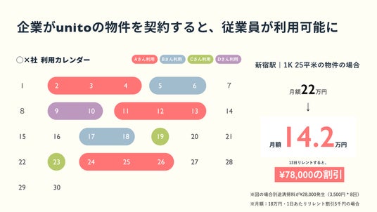 こうした背景を受け、Unitoは独自の料金システム「リレント(Re-rent)」を活用した法人向け入居プランの提供を開始します。「リレント」の導入により、部屋を使用しない日の家賃は発生せず、通常の1泊から宿泊をした場合の料金と比較して最大約70%OFFを実現しました。新たなプランの提供により、ホテル価格の高騰に左右されることなく、企業の多拠点進出を支援します。