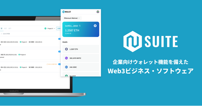 N Suiteは、企業向けのウォレット機能を備えたWeb3ビジネス・ソフトウェア(SaaS)です。企業がWeb3領域で事業を行うにあたって秘密鍵を保有する場合に、セキュリティや内部統制を考慮した秘密鍵管理ができる機能や、Web3領域の事業で必要な暗号資産の送金やNFT発行、スマートコントラクトの運用などを安全かつ効率的に行える機能を提供しております。