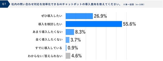 社内の問い合わせ対応を効率化するために「AIチャットボットを導入したい」と回答した担当者は82.5%でした。その理由として、最多が「戦略的業務に充てる時間を増やしたい」(67.4%)、次いで「ナレッジを蓄積・共有したい」(48.3%)という結果になりました。