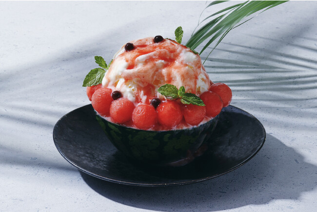 すいかのみずみずしい果汁がシェイブアイスのミルクと調和します。種に見立てたタピオカの食感もお愉しみください。