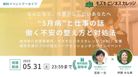 就労移行支援事業所・キズキビジネスカレッジ(KBC)が2025年5月14日(水)に開催した、5月病や働くことへの不安に寄り添う無料オンライントークイベントのイベントアーカイブ動画を無料でプレゼントします。支援現場で実際に相談を受けているスタッフ2名が登壇し、気軽に話せる30分で“自分の状態との向き合い方”をお届けしました。