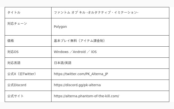 次世代型美少女放置RPG『ファントム オブ キル -オルタナティブ・イミテーション-』は大ヒットモバイルゲーム『ファンキル』の世界観やキャラクターを用いた新しいゲームになります。『ファンキル』で登場したキル姫たちの育成を極め、ステータスやスキルを吟味することであなただけの唯一無二のキル姫を育て上げることが出来ます。さらに、ブロックチェーンゲーム特有の体験として、育成したキル姫をNFT化してのゲーム外への持ち出しや、GameFi要素を通した暗号資産の獲得が可能です。