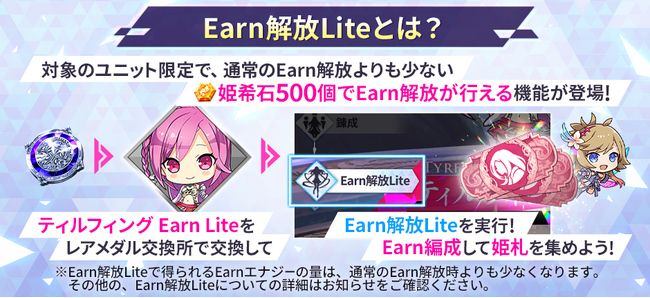 ※Earn解放Liteで得られるEarnエナジーの量は、通常のEarn解放時よりも少なくなります。その他の、Earn解放Liteについての詳細はゲーム内のお知らせをご確認ください。