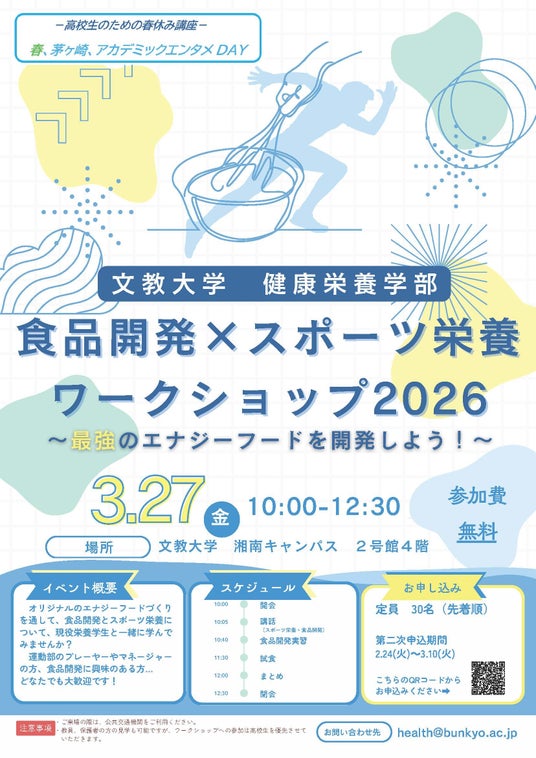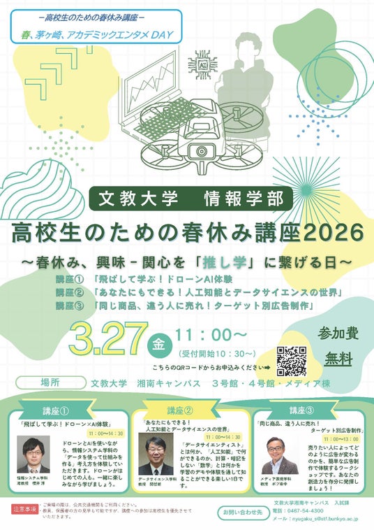 文教大学湘南キャンパス(神奈川県茅ヶ崎市)は、2026年3月27日(金)、高校生を対象とした春休み特別講座「春、茅ヶ崎、アカデミックエンタメDAY」を開催いたします。