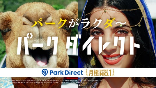 パークダイレクト のカラーである “青” を基調とした布を背中に掛け、砂漠の国から“車両”として来日したラクダが首から日本のナンバープレートを下げ、月極駐車場に座って「駐ラクダ」している強烈なインパクトのCMです。ラクダの持ち主である“女性(=ドライバー)”も登場し、スマホで月極駐車場が契約できて喜び踊っています。