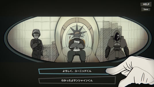 アドベンチャーパートでは、ディストピア世界に暮らすさまざまな悪人たちと対峙します。ギャングのヘッドを務めるウニ、自分をキャビネットと信じるカルト宗教の狂信者など、登場するキャラクターは個性豊かな曲者揃い。ゲーム画面には常に主人公自身の「手」が映り込み、鮮やかなアニメーションで彼らとの対話を彩ります。