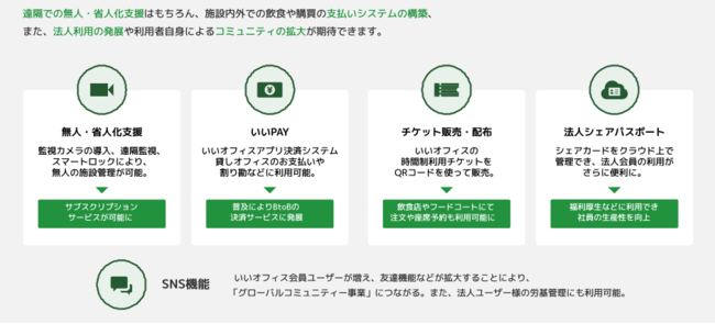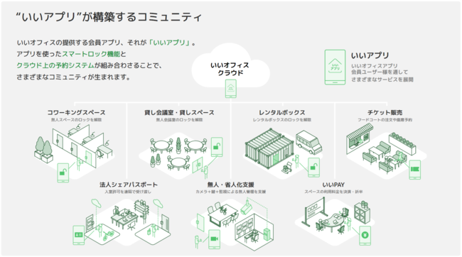 あらゆるスペースやサービスの解錠から決済までを一元化できる「いいアプリ」。これまではコワーキングスペースやシェアオフィスをはじめとする働く場所に特化したサービスでしたが、スマートロック連携や「いいPAY」機能が加わったことによって、レンタルスペースやレンタルボックス、シェアサイクル、カーシェアリングなど、対象は鍵と決済が連動したあらゆるサービスに拡大しました。